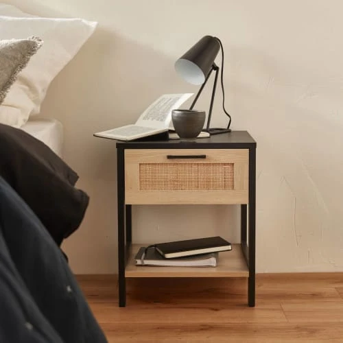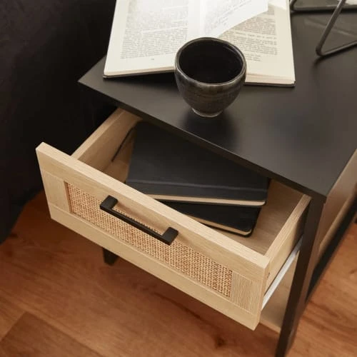 La table de chevet Bianca a tout ce qu’il faut pour vous séduire. On adore le contraste qu’apportent le décor bois clair et le noir, le tout rehaussé par une note de cannage discrète. Placée à côté de votre lit, elle pourra accueillir vos objets du quotidien. Elle est dotée d’un tiroir, parfait pour ranger tout votre petit bazar et d’une étagère pour poser vos livres du moment.